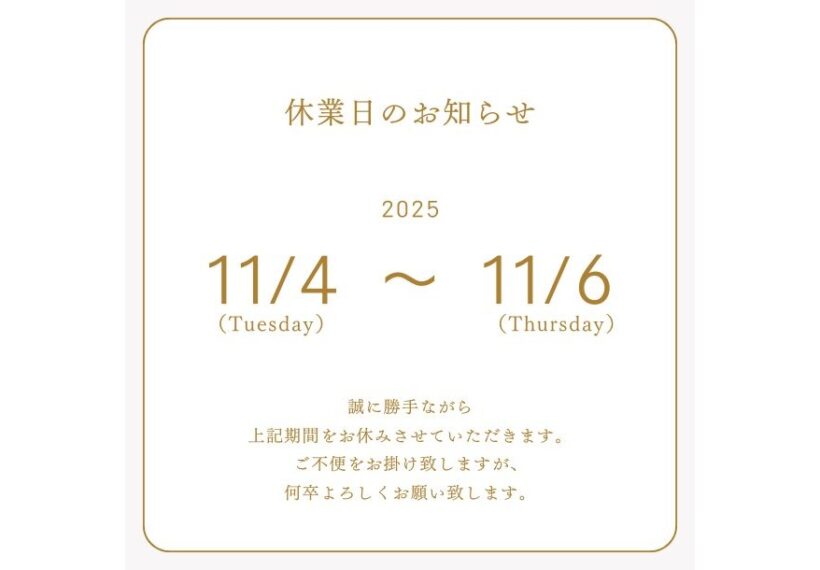 2025年11月4日(火)~2025年11月6日(木)までお休みさせて頂きます。